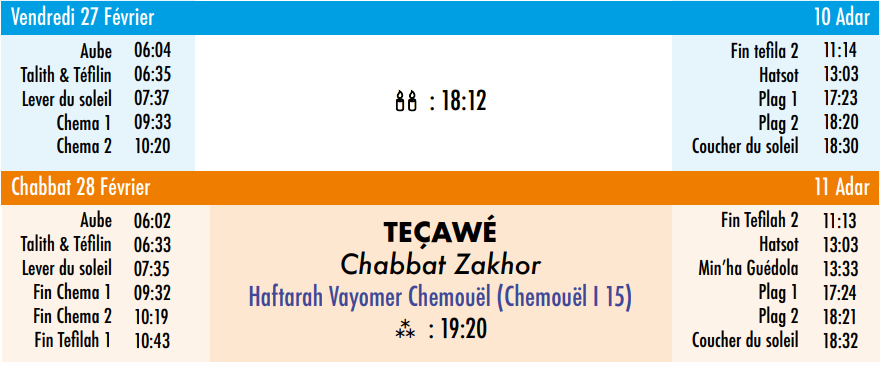 ATTENTION : on sort 2 sifrei torah, un pour la paracha de la semaine, et un pour le passage que l’on lit « Chabbat Zakhor », la semaine précédant Pourim (« Zakhor èt Acher ‘Assa Lékh’a ‘Amalek« … (qui se trouve dans le livre de Dévarim, Paracha Ki Tétsé chapitre 17- verset 8 : « Souviens-toi de ce que t’a fait Amalek », Aman était un descendant d’Amalek).