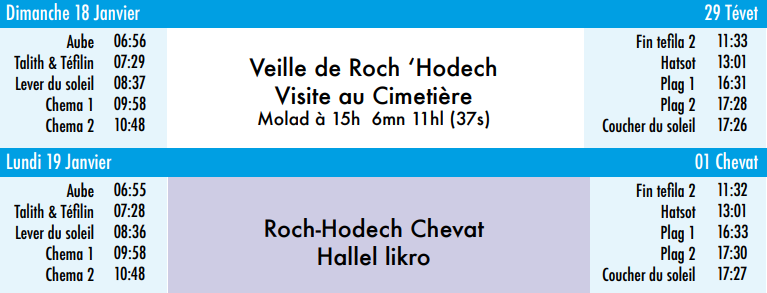 Roch ‘Hodech Chevat débute dimanche soir soir 18 janvier 2026 jusqu’à lundi soir 19 janvier 2026 (1 seul jour de Roch ‘Hodech)
