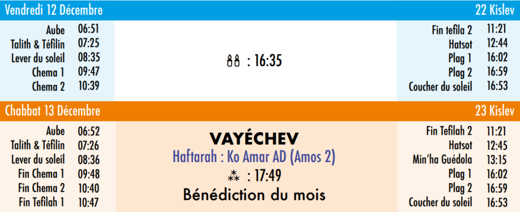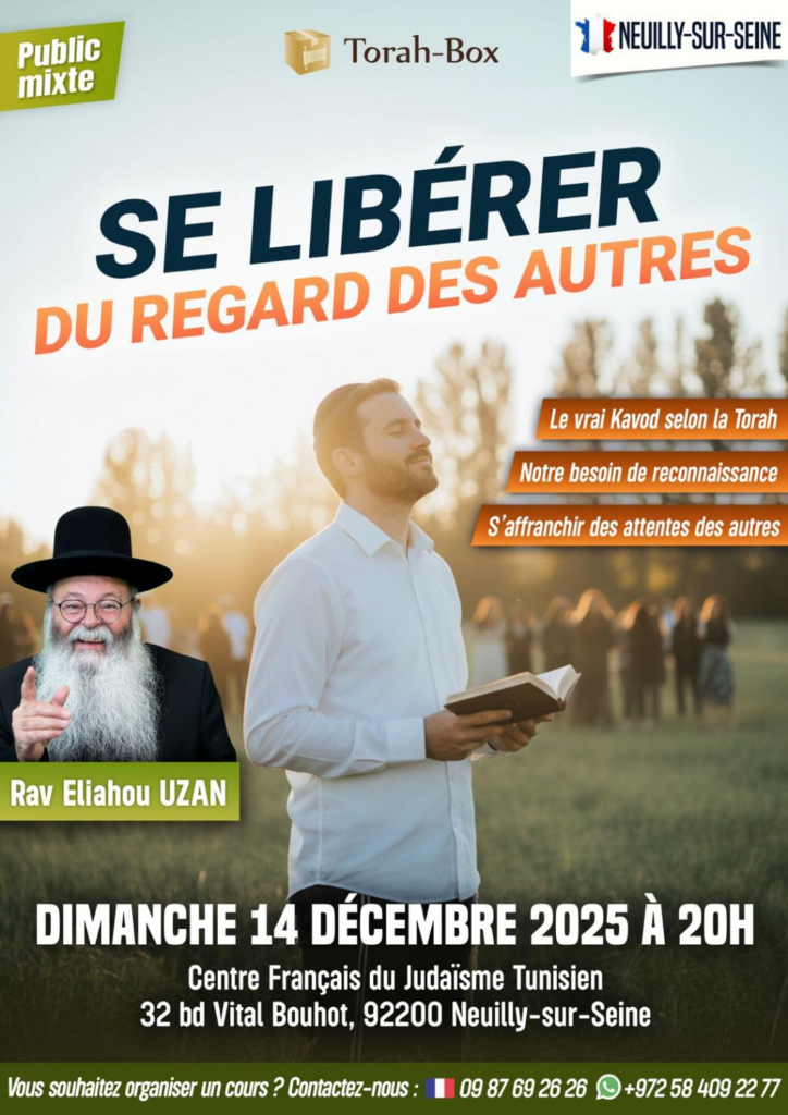 - Dimanche 14 décembre – 20 H en partenariat avec Torah Box : Conférence du Rav Eliahou UZAN : « Se libérer du regard des autres«
