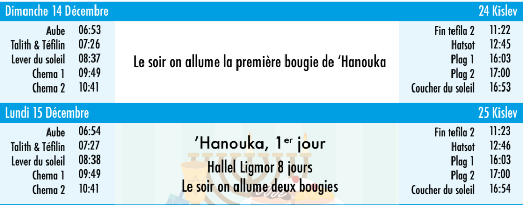 - Hanouka : dimanche 14 décembre, allumage de la 1ère bougie