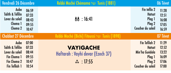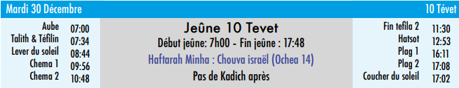 - Mardi 30 décembre : jeûne du 10 Teveth